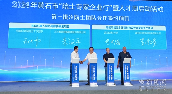 現(xiàn)場還舉行了項目簽約活動,簽約移動機器人核心零部件研發(fā)項目、高端功能性牛仔面料的設計開發(fā)與生產項目等2個院士專家合作項目、球墨鑄鐵管壁測量項目等10個人才合作項目以及4個人才服務合作項目,并為鄂東技師學院國家級高技能人才培訓基地授牌。