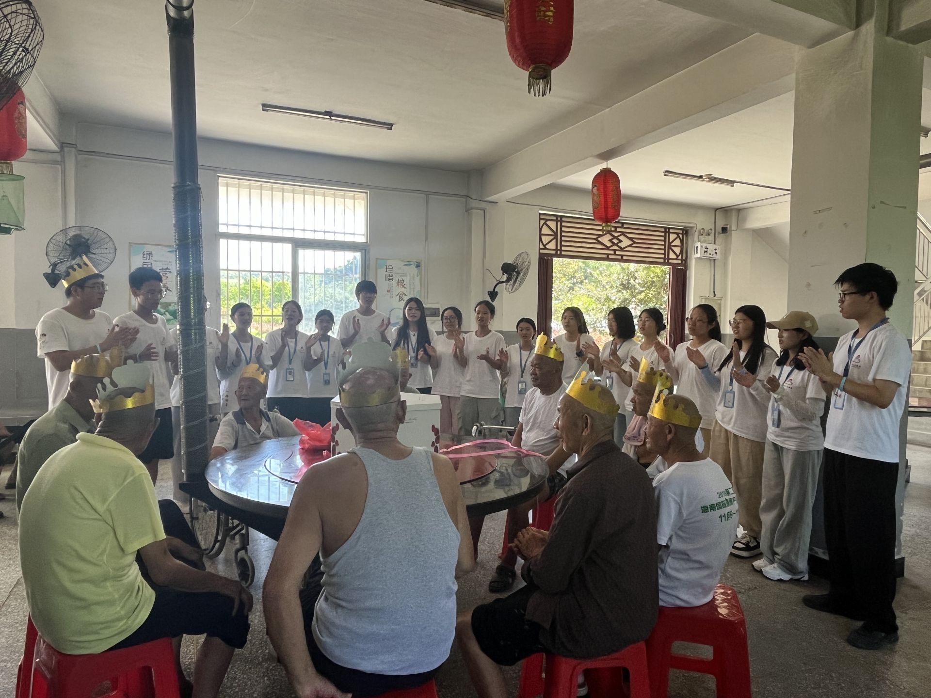 中午,大別山支教團志愿者和福利院工作人員一起配菜做菜,煮長壽面,通過唱生日祝福歌、表演手勢舞、做小游戲等方式為老人慶祝生日。“我覺得老年人生活很不方便也很不容易,想用自己的力量給他們帶來溫暖,希望社會多多關(guān)心關(guān)愛老人?!崩霞沂谴笪蚩h宣化店鎮(zhèn)的第十三屆大別山支教團成員、湖北大學(xué)研究生林青說。