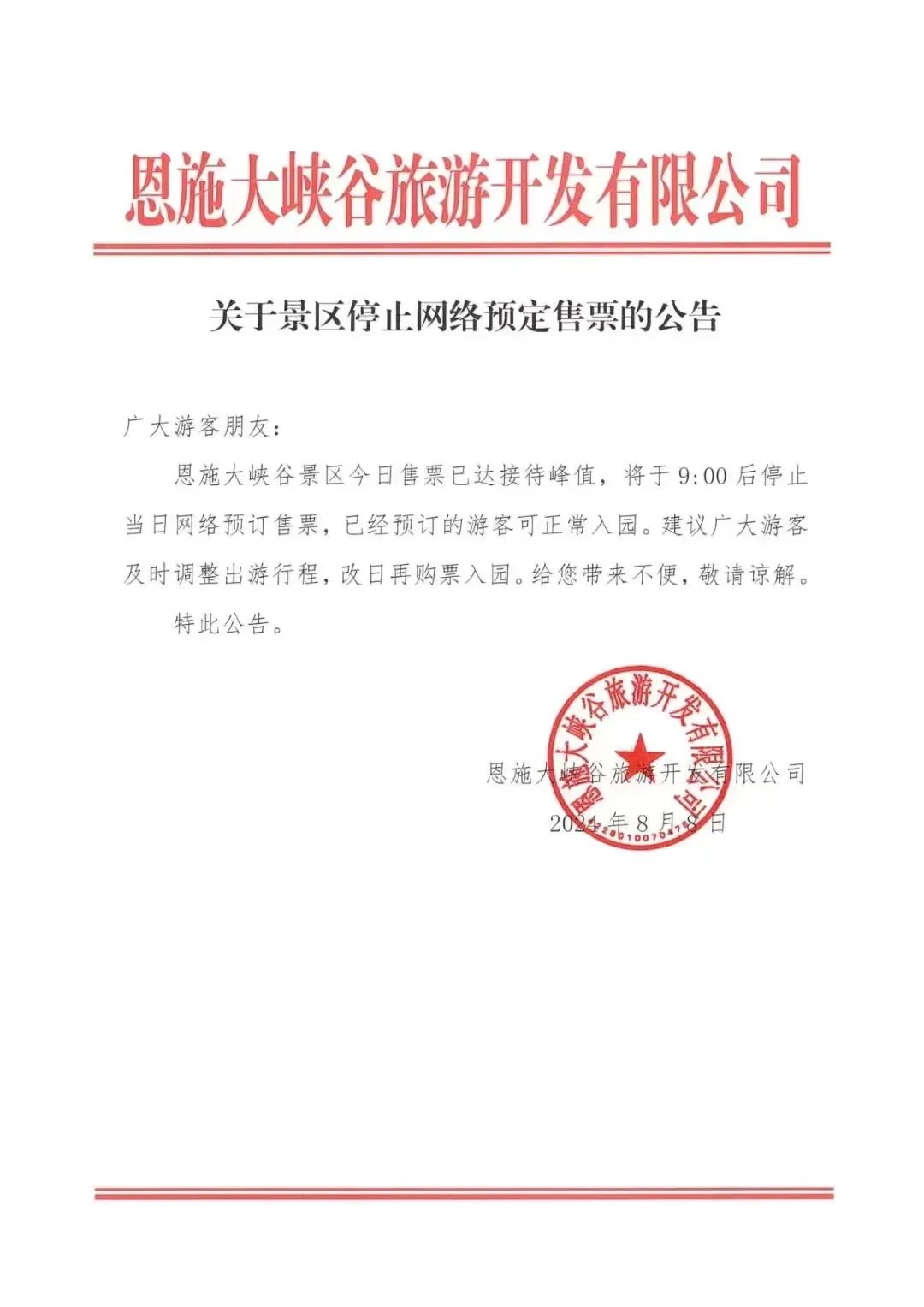 隨著旅游旺季的到來(lái),為了確保各位游客的游覽體驗(yàn)和安全,今日恩施大峽谷景區(qū)售票已達(dá)到接待峰值,將于9:00后停止當(dāng)日網(wǎng)絡(luò)售票。