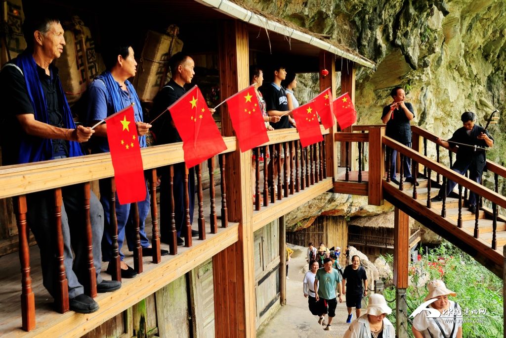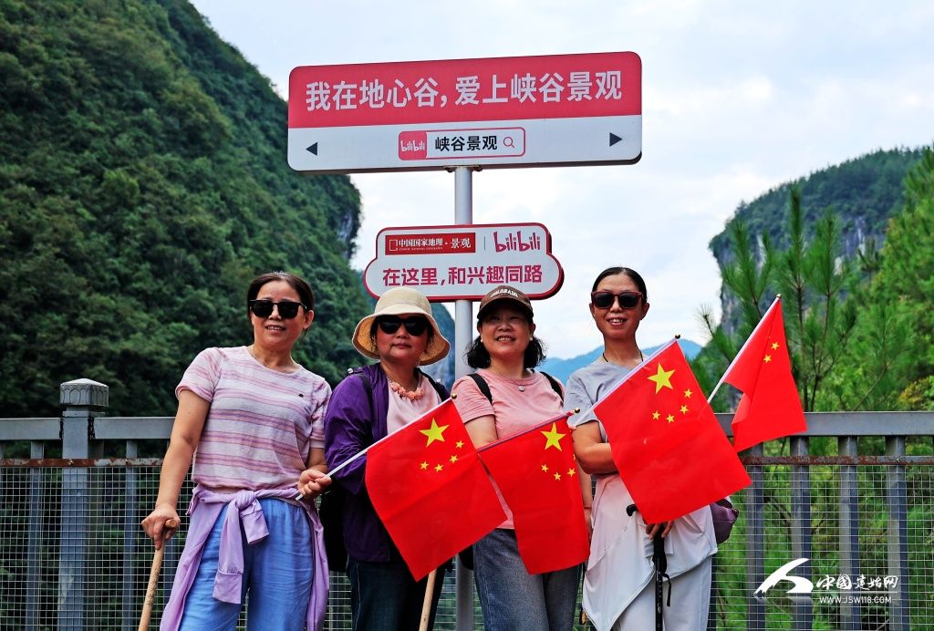 金秋時(shí)節(jié)的地心谷,青翠的松和五彩的落葉林交織相間,構(gòu)成五彩斑斕的畫(huà)卷。此刻,處處紅旗招展,游人可手拿國(guó)旗登山游覽、打卡留念,在金色的陽(yáng)光下愜意游玩,樂(lè)享假日時(shí)光。