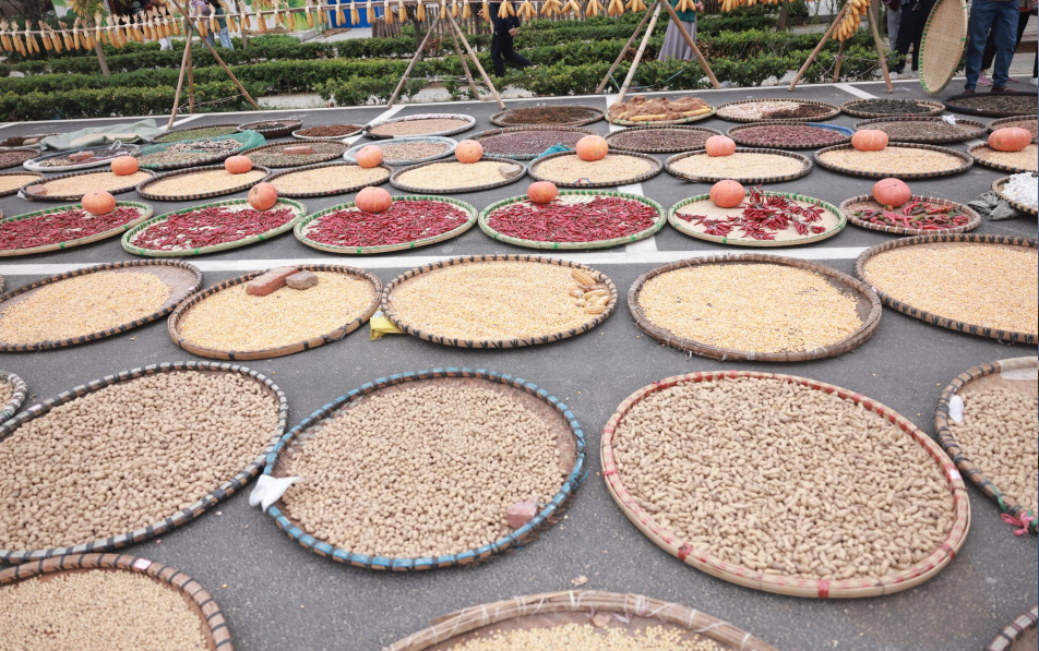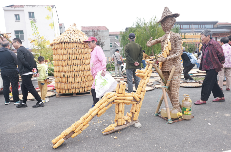 在該鎮(zhèn)盛砦村花海停車場村民們紛紛將自家種的玉米、向日葵、棉花、黃豆、花生、芝麻、南瓜、辣椒、老葫蘆、老絲瓜等農(nóng)產(chǎn)品進行晾曬,創(chuàng)意的卡通圖案,吸引了不少游客前來觀光打卡。