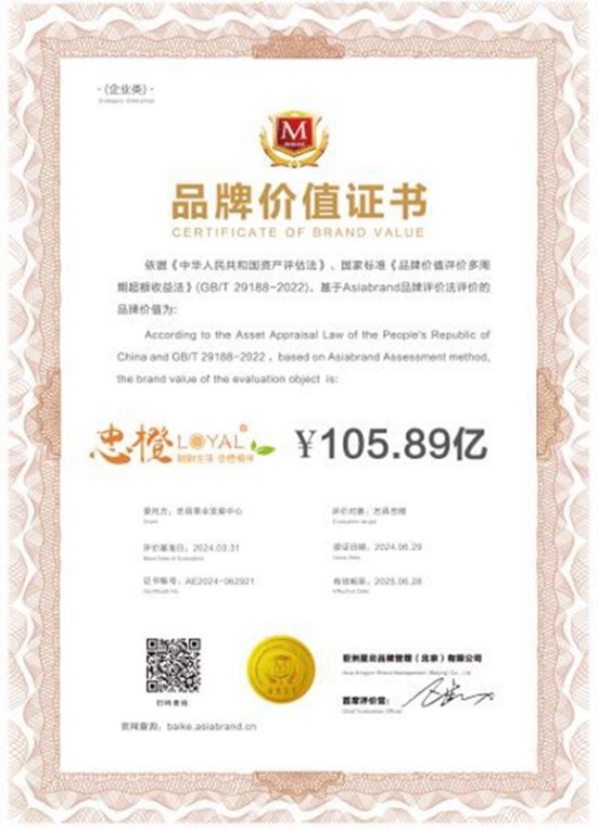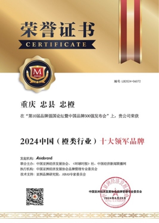 目前,“忠縣柑橘”已獲國家質(zhì)檢總局地理標(biāo)志保護(hù)認(rèn)證,今年6月,第10屆品牌強(qiáng)國論壇在北京舉行。會上,忠縣忠橙憑借卓越品質(zhì)與品牌影響力,獲得“2024中國品牌500強(qiáng)”“2024中國(橙類行業(yè))十大領(lǐng)軍品牌”兩項(xiàng)榮譽(yù),其品牌價(jià)值躍升至105.89億元,標(biāo)志著忠縣忠橙品牌建設(shè)取得歷史性突破。