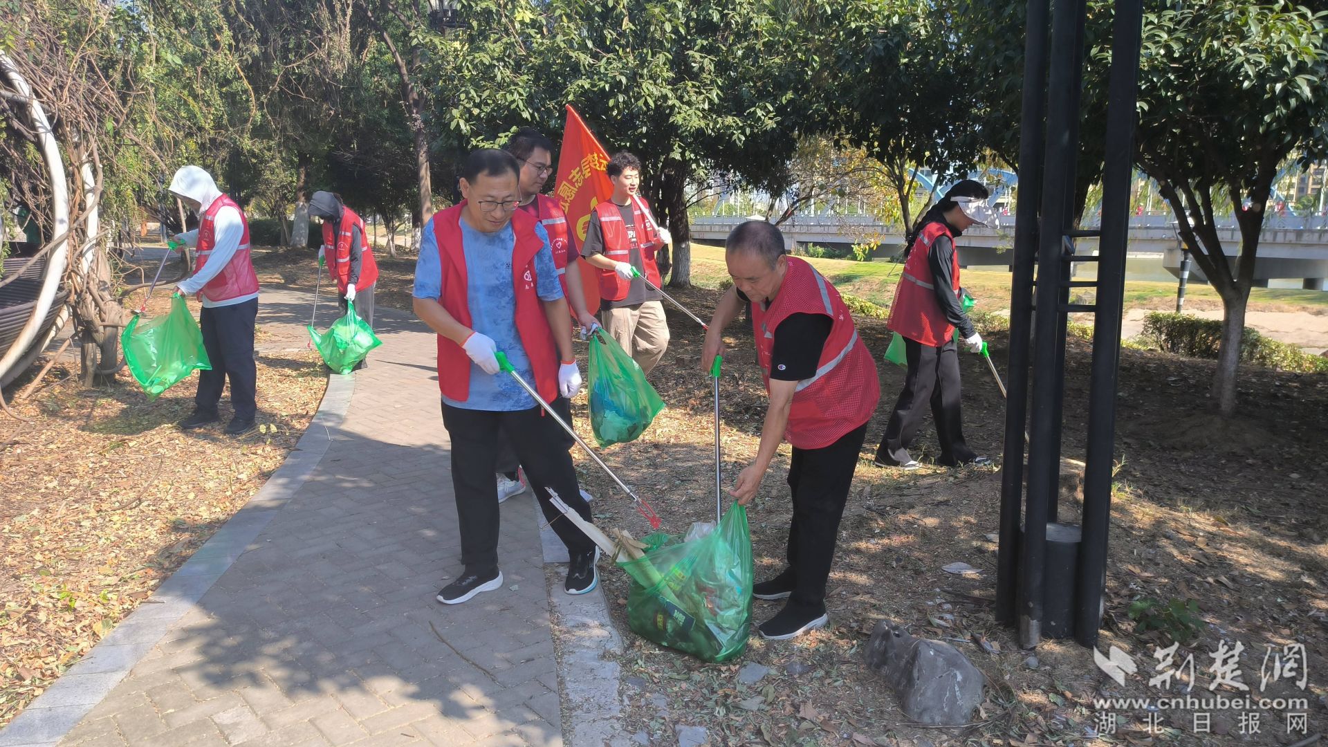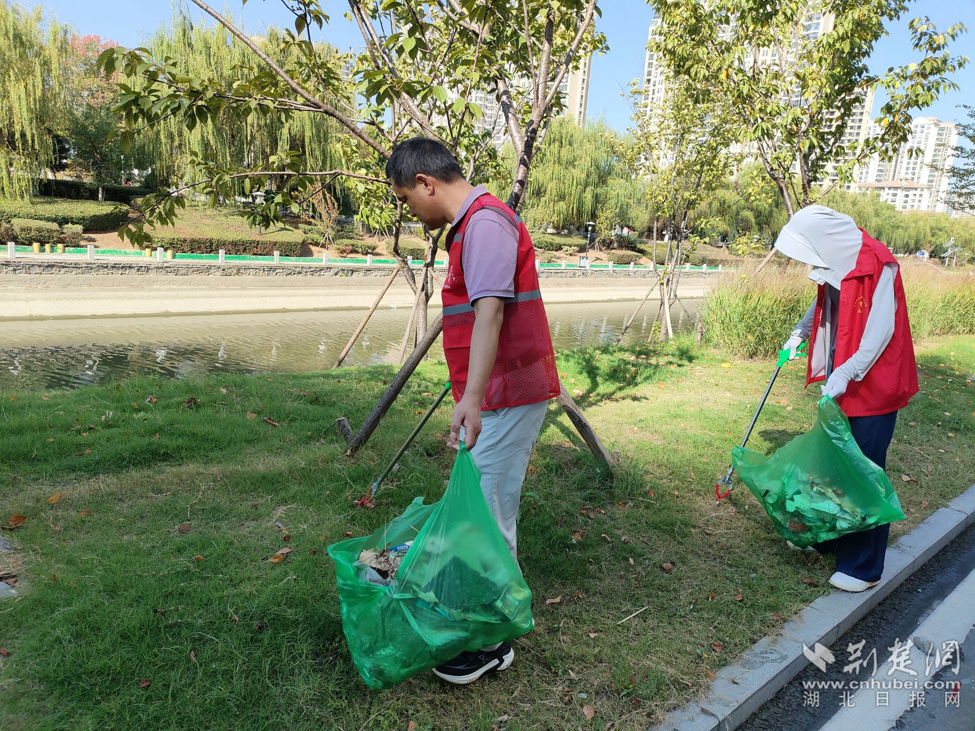 秋天的陽光暖暖地照著大地,曲陽河畔蕩漾著青春的氣息。志愿者身穿紅馬甲,沿著曲陽河三湖橋段至都市云頂段,他們有的戴著手套撿拾地面的紙屑、煙頭,有的用鉗子夾取岸坡邊的盒子、飲料瓶,有的在打撈河面的漂浮物,有的將一袋袋裝好的垃圾投入垃圾桶里……