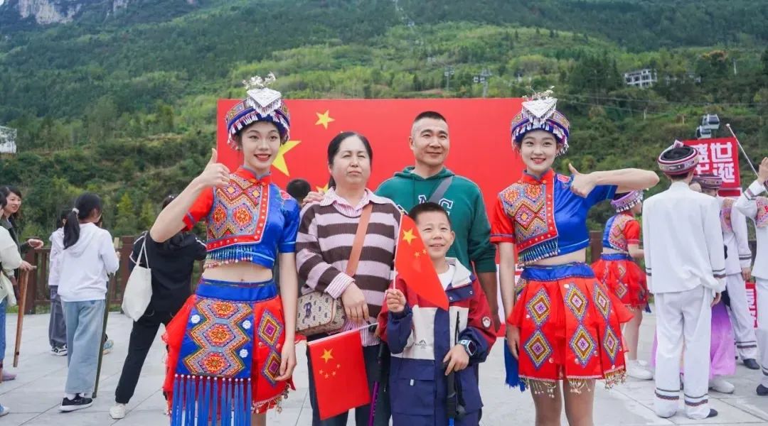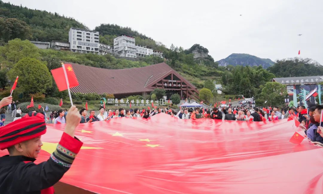 恩施大峽谷景區(qū)組織“盛世華誕 國旗飛揚”快閃活動。大型無人機懸掛國旗在峽谷飛行,游客同跳擺手舞,同唱《我和我的祖國》,現(xiàn)場游客激動不已,歡呼聲、吶喊聲響徹整個峽谷。聊天式講解、鼓勵式爬山、還送拍照攝影服務(wù)的“陪爬”志愿者最“搶手”。假期間景區(qū)連續(xù)達到游客峰值。
