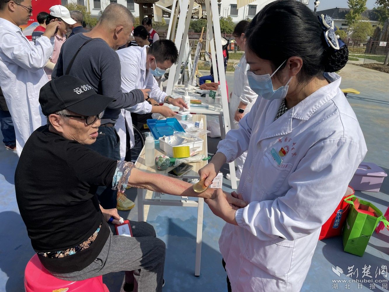 義診現(xiàn)場,醫(yī)護人員仔細詢問每位老人的身體狀況和日常用藥情況,對他們進行詳盡的身體檢查,而且還為老人們帶來了特色中醫(yī)外治技術: 腕踝針、耳穴埋豆、穴位貼敷、溫通刮痧、艾灸等。