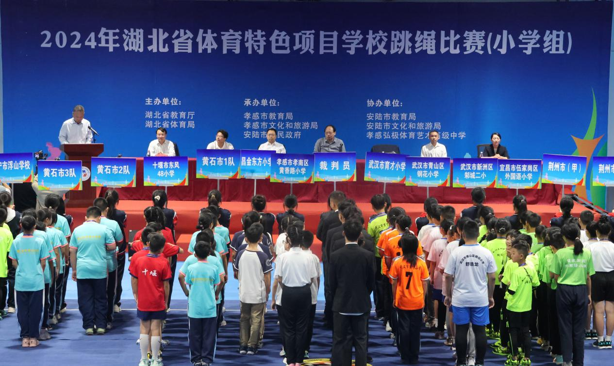 丁雪峰宣布2024年湖北省體育特色項目學校跳繩比賽(小學組)正式開賽。