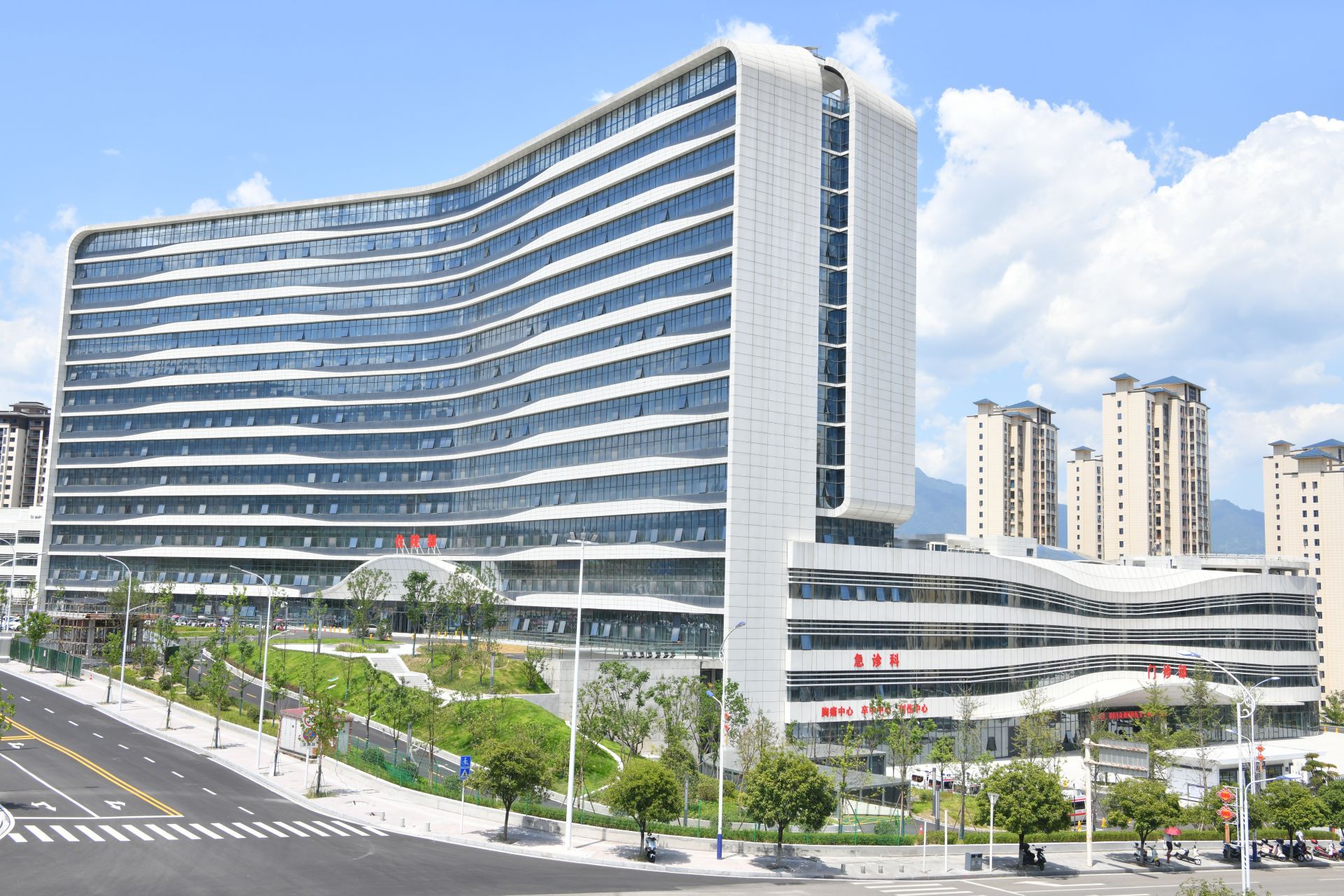 走進醫(yī)院院區(qū),門前道路寬敞整潔,筆直延伸至大樓門前,兩旁綠化帶規(guī)劃有序,綠草如茵,樹木挺拔。