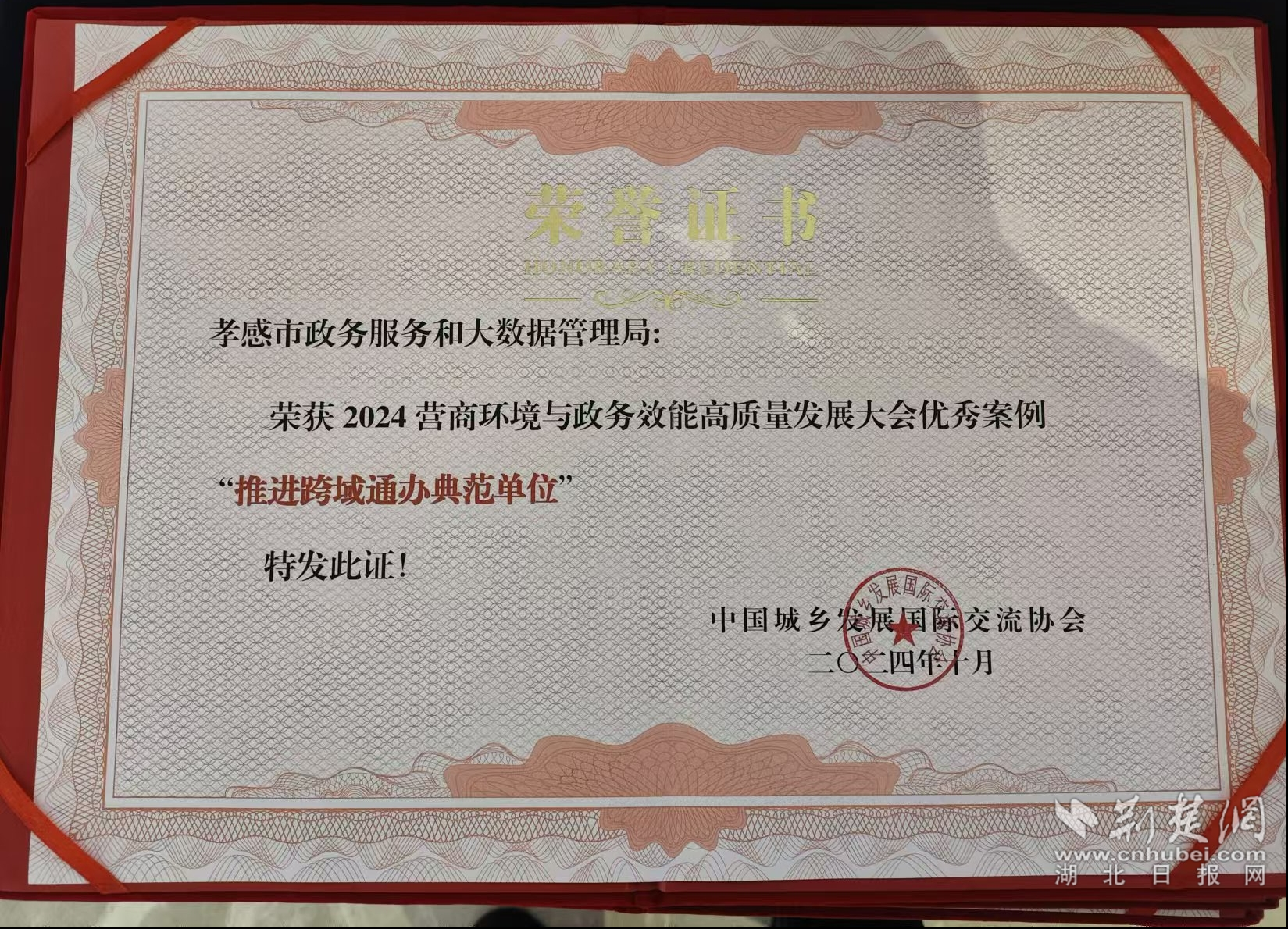 荊楚網(wǎng)(湖北日報(bào)網(wǎng))訊(通訊員 葉進(jìn)軍、戰(zhàn)婷婷)10月17日,2024營商環(huán)境與政務(wù)效能高質(zhì)量發(fā)展大會在北京市通州區(qū)舉行。經(jīng)組委會推薦、專家評審委員會評審,《孝感市“跨域通辦”新模式促進(jìn)政務(wù)服務(wù)效能再提升》《深化“一窗通辦”改革 助力“高效辦成一件事”》《做實(shí)惠企政策推送 推動營商環(huán)境優(yōu)化》3個案例入圍優(yōu)秀案例,孝感市獲評“推進(jìn)跨域通辦典范單位”“政務(wù)增值服務(wù)典范單位”“區(qū)域經(jīng)濟(jì)發(fā)展創(chuàng)新單位”3項(xiàng)獎項(xiàng)。