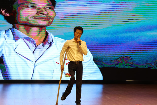 杜詠梅的《牽手》,講述了一位教師與一名自閉癥兒童的故事。“吾國萬疆以仁愛,千年不滅的信仰......”現(xiàn)場觀眾應(yīng)節(jié)合拍,氣氛達到了高潮。