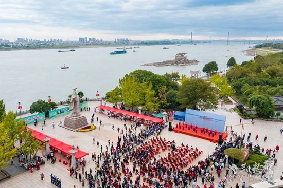 鑼鼓表演《中國范兒》、朗誦串燒《萬里長江第一閣》、楚風楚韻《編鐘樂舞》……當天上午,熱鬧非凡的孫權(quán)廣場與江中靜靜矗立著的觀音閣遙遙相望,眾多文藝節(jié)目輪番上演,為現(xiàn)場群眾提供了一場古風古韻的視聽盛宴。