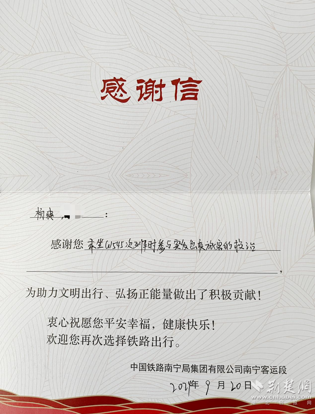 荊楚網(湖北日報網)訊(記者葉修頎 通訊員羅津)10月19日,孝感市中心醫(yī)院骨科Ⅱ脊柱病區(qū)醫(yī)生楊爽收到了一份特殊的禮物——一封來自中國鐵路南寧局集團有限公司南寧客運段的感謝信以及一款“鐵潮”文創(chuàng)背包,以感謝他的一次緊急救助行動。
