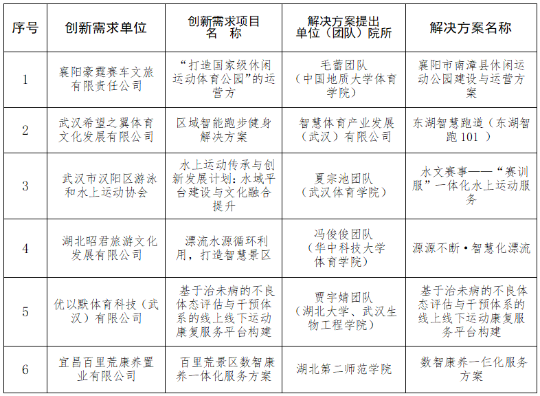 2024年6月12日,省體育局發(fā)布了《關于開展2024年湖北省體育產業(yè)創(chuàng)新創(chuàng)業(yè)大賽的公告》,在全省范圍內征集體育產業(yè)創(chuàng)新需求和解決方案。10月29日,省體育局組織專家對參賽項目進行了初賽評審,最終,推薦體育服務類、體育制造類各前六名進入決賽路演?,F(xiàn)將進入決賽路演的項目名單進行公示,公示期3天,公示時間為10月30日至11月1日。