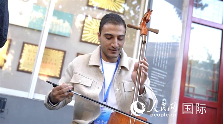 埃及記者馬贊體驗馬頭琴。人民網(wǎng)記者 袁蒙攝