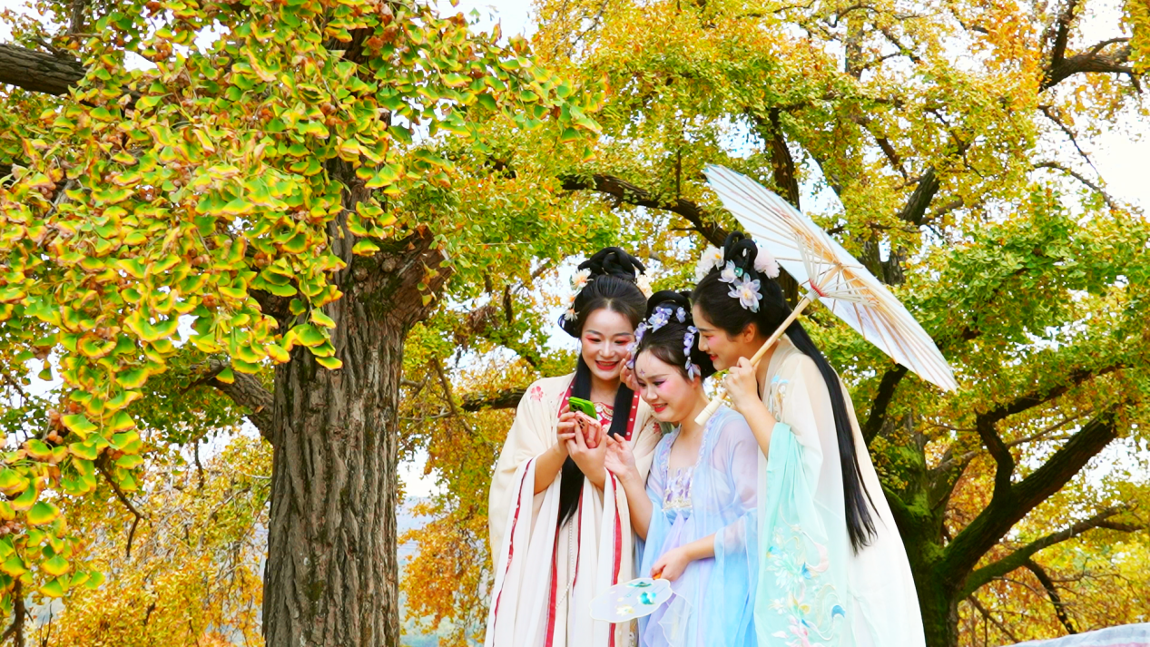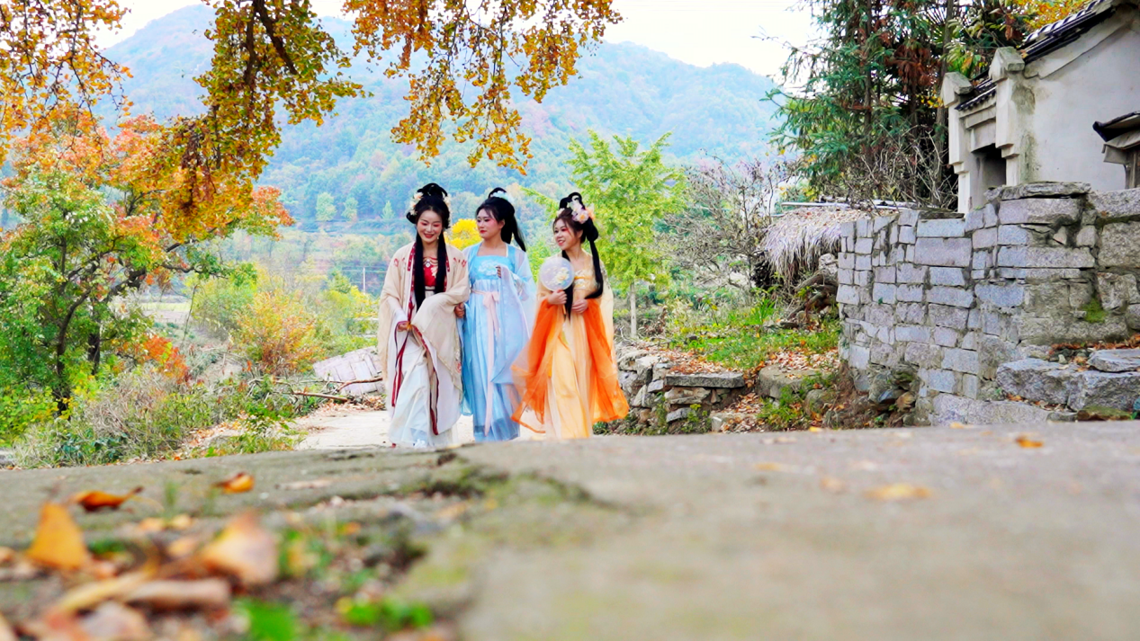 “這里的秋色太美了,今天和朋友們穿著漢服來這里拍照打卡,游一游傳統(tǒng)古村落,感覺非常的舒適愜意?!毙⒏杏慰完惸教m說。