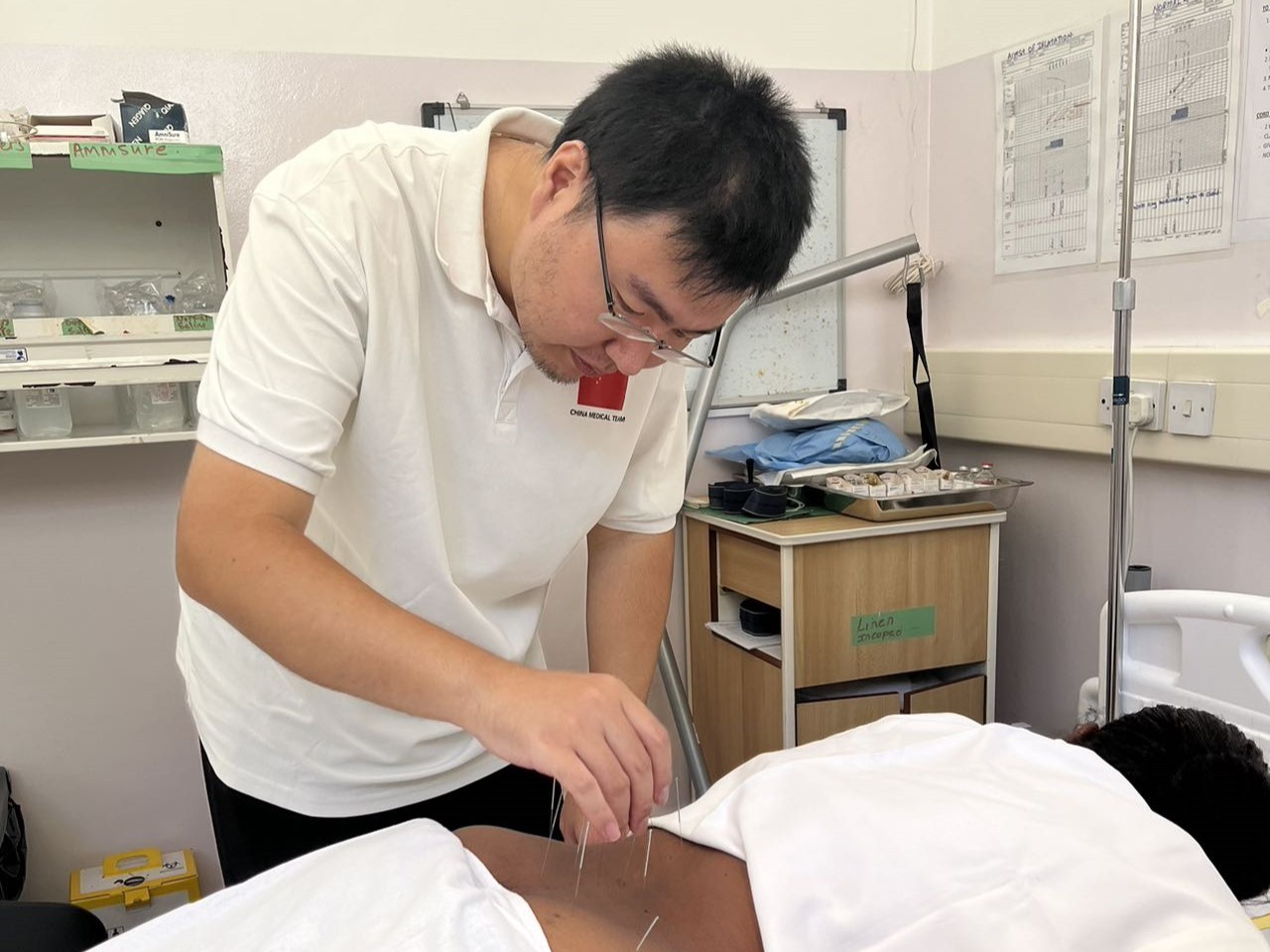 患者在接受針灸治療。中國(guó)援塞舌爾醫(yī)療隊(duì)供圖