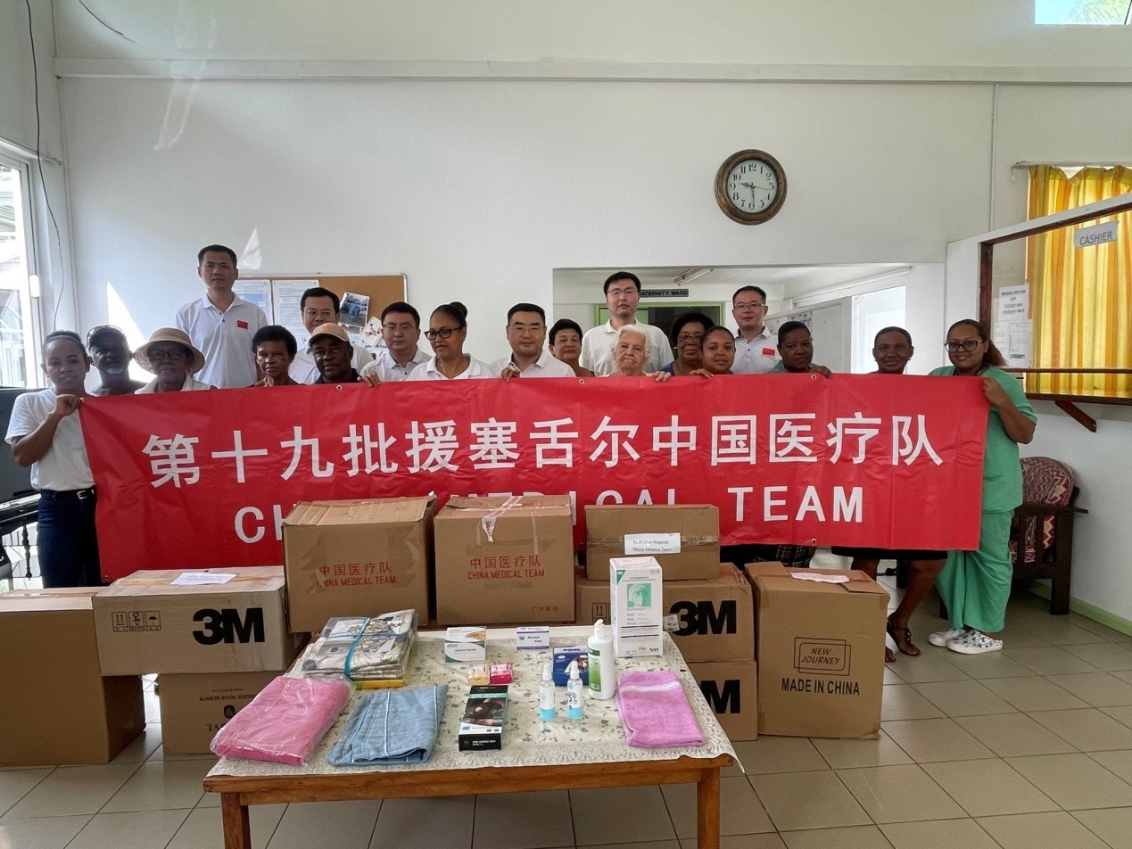 中國(guó)援塞舌爾醫(yī)療隊(duì)向普拉蘭島醫(yī)院捐贈(zèng)物資。中國(guó)援塞舌爾醫(yī)療隊(duì)供圖