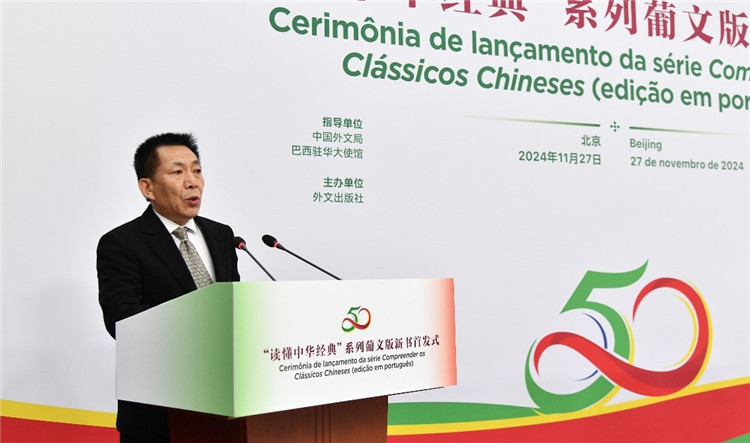 “讀懂中華經(jīng)典”系列葡文版新書首發(fā)式27日在京舉行,圖為外交部拉美司參贊張文偉在發(fā)表致辭。圖片由中國外文局提供