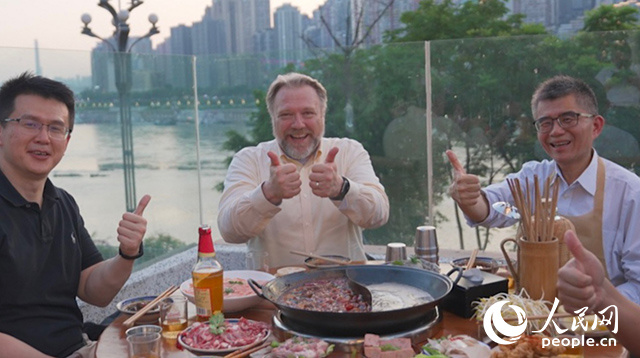 前康寧顯示科技事業(yè)部全球拓建項(xiàng)目總監(jiān)軻寶華(中)和同事在重慶南濱路吃火鍋。人民網(wǎng)記者 蘇纓翔攝