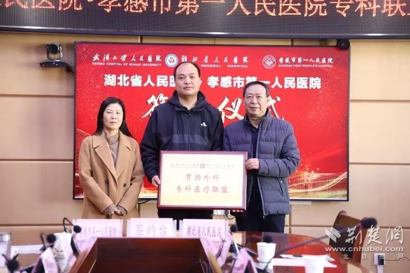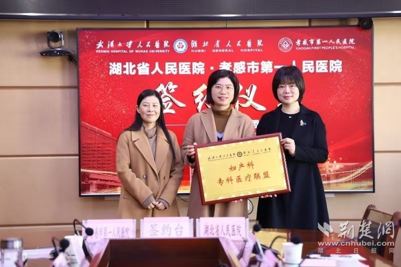 荊楚網(湖北日報網)訊(通訊員胡佳萍)11月28日,武漢大學人民醫(yī)院授予孝感市第一人民醫(yī)院“婦產科專科醫(yī)療聯盟”“胃腸外科??坡撁恕焙汀傲只蹜c教授專家團隊工作室”牌匾,并現場簽約,開啟兩院合作新篇章。