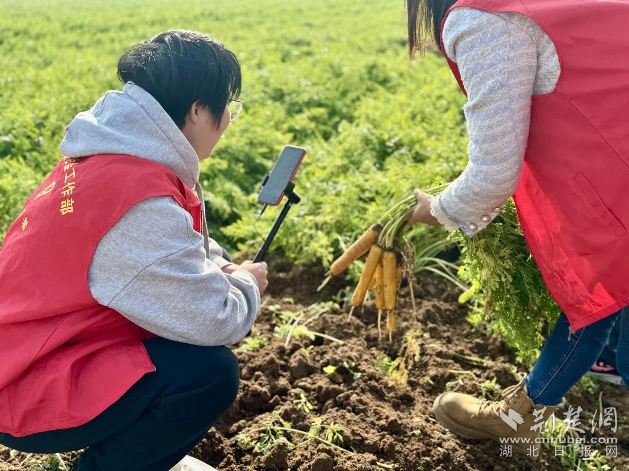 “我們現(xiàn)在所處的位置是應(yīng)城市城中街道周陳村,這是剛剛從田里挖出來的胡蘿卜,天然無污染!”直播鏡頭前,一壟壟“黃玉”胡蘿卜長勢喜人,主播們現(xiàn)場采摘、試吃,向直播間的網(wǎng)友們介紹胡蘿卜的品質(zhì)和口感。