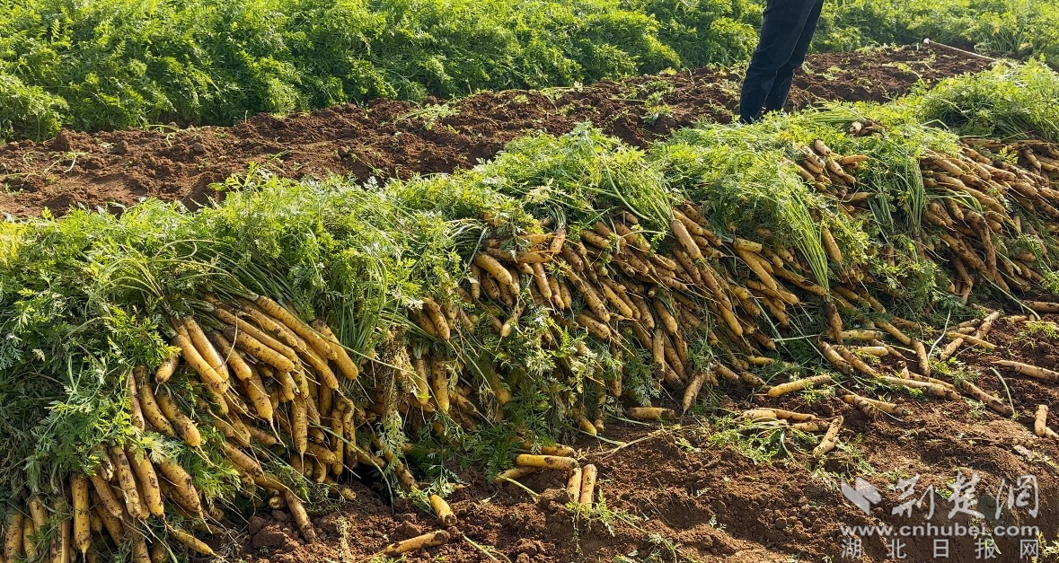 “黃玉”胡蘿卜的豐收和暢銷,得益于鄉(xiāng)賢的引領(lǐng)和帶動。應(yīng)城市城中街道周陳村沿富水河而居,耕地面積1217畝,以“黃玉”胡蘿卜種植為主。周陳村大多的村民過去以碎片化種植蘿卜、白菜等蔬菜為主,只能靠自己拖去農(nóng)貿(mào)市場擺攤銷售,經(jīng)常出現(xiàn)滯銷的情況,辛苦種植的蔬菜只能爛在地里,靠種菜而生的村民生活更加困難。
