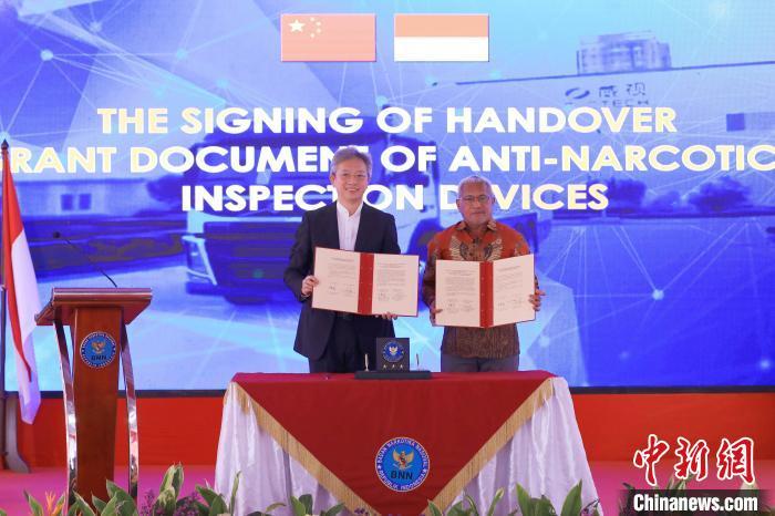 中國駐印尼大使王魯彤和印尼國家禁毒委員會(huì)主席馬蒂努斯分別代表中印尼兩國政府簽署設(shè)備交接證書。中新社記者 李志全 攝