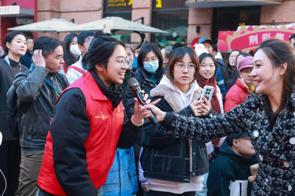 在詩(shī)詞歌賦秀環(huán)節(jié),現(xiàn)場(chǎng)觀眾與主持人精彩互動(dòng),通過(guò)詩(shī)詞讓大家了解荊州的歷史文化。在街區(qū)的中央,主辦方還專門設(shè)置了“荊彩集市”,帶有楚繡技藝的絲巾、極具楚文化色彩的銅鏡、用刻鏤技藝仿制的鏤空勺、制作精巧的鑰匙扣……展臺(tái)上琳瑯滿目的文創(chuàng)產(chǎn)品引得來(lái)往游客駐足流連。