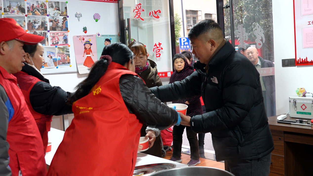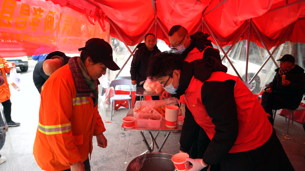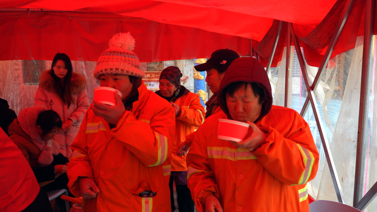“我們早上起來很冷的,今天是臘八節(jié),政府送溫暖,給我們喝粥,喝得心里暖暖的,還有包子、油條、雞蛋,對我們環(huán)衛(wèi)工人很貼心、很溫暖?!杯h(huán)衛(wèi)工人江秋珍說。
