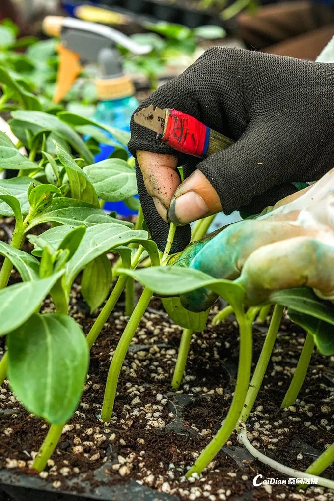 廣西 “女子嫁接隊(duì)” 帶頭人梁麗麗率姐妹去年12月底扎根基地開展嫁接。只見她熟練地掐掉瓜芯,用專業(yè)的自制刀具斜切掉西瓜接穗苗的根部,再迅速將其插入頂端葫蘆砧木,整個(gè)過程行云流水,不到6秒就能完成一株西瓜苗的嫁接。她表示:“我們是12月25日過來的,一共11個(gè)姐妹,每天嫁接6萬株,150萬株西瓜苗能在春節(jié)前全部嫁接完成?!?/p>