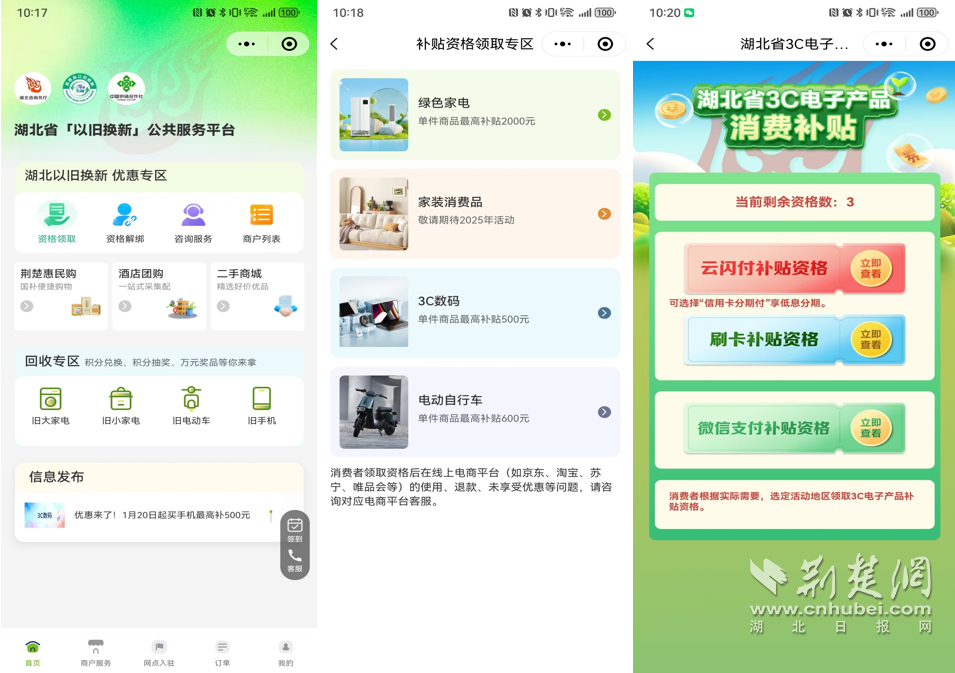 1、 打開微信搜索“湖北省以舊換新公共服務(wù)平臺”,進行登陸認證;