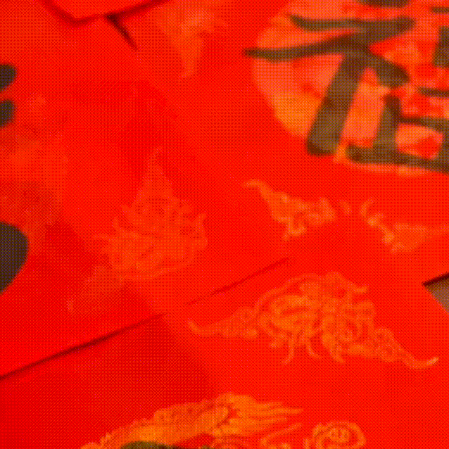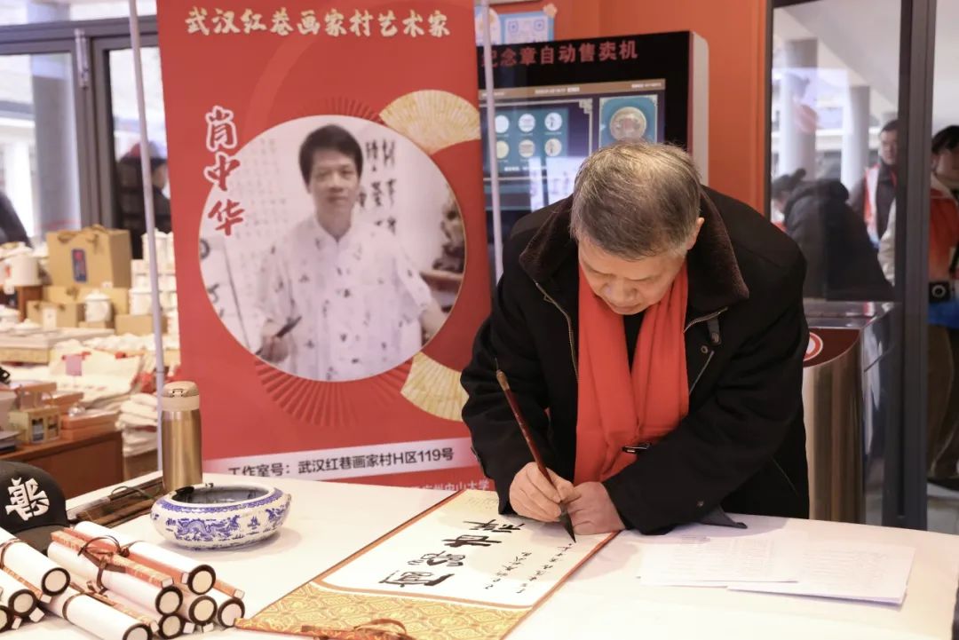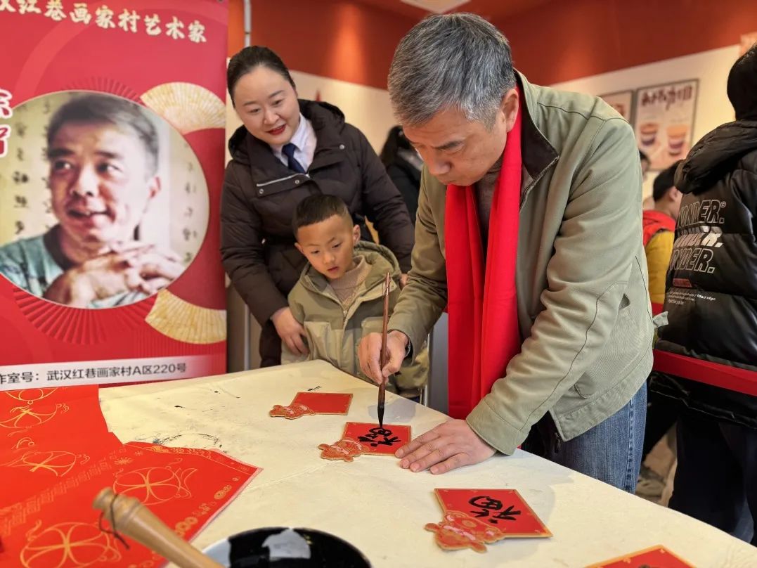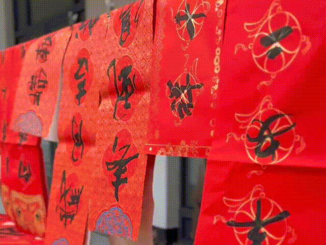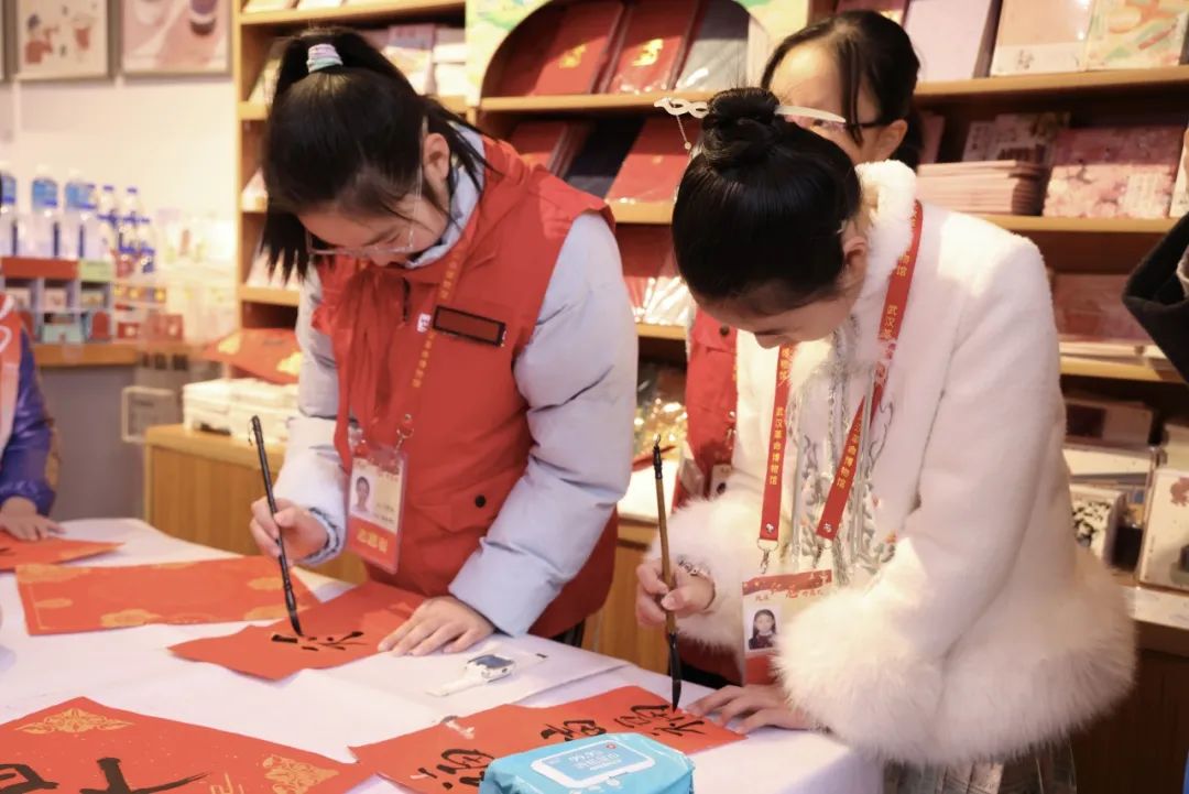 紅巷畫家村藝術(shù)家徐智、肖中華、張永偉三位老師攜手“紅巷苗苗”余錦希 、付珞桐、謝佳琪、江昱萱、王千溢等,凝神聚氣、揮毫潑墨,一副副寓意祥瑞的春聯(lián),一張張飽含祝福的福字,透著墨香,承載著吉祥,化作最真摯的祝福送到觀眾手上。