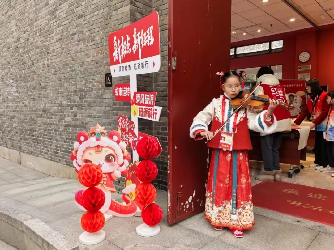 貼春聯(lián)、寫福字是小年的傳統(tǒng)習(xí)俗。伴隨著“紅巷苗苗”余昕遠帶來的悠揚的小提琴曲目《新春樂》,“老少同書祝福聯(lián)”拉開序幕。
