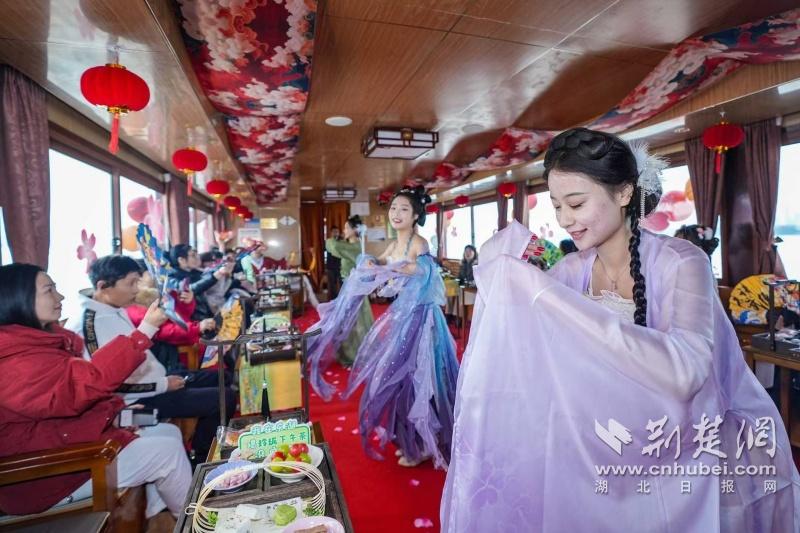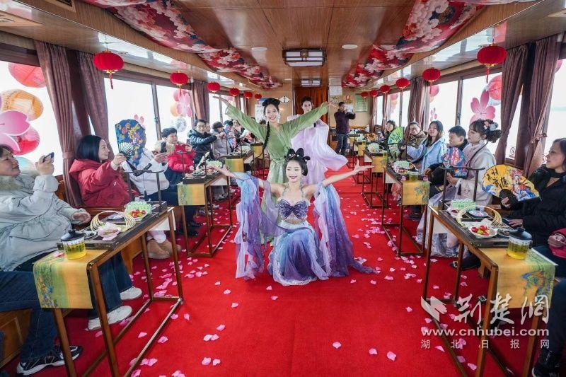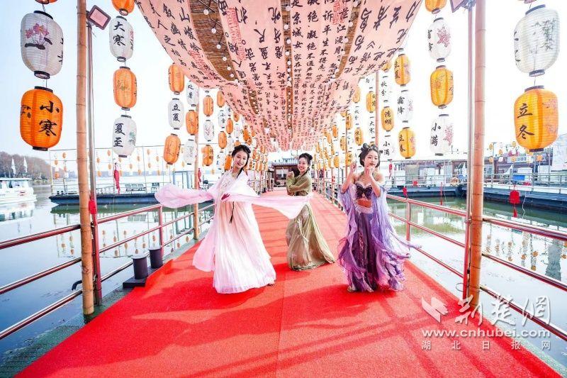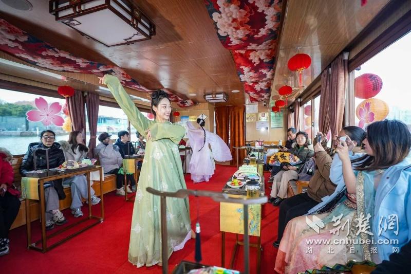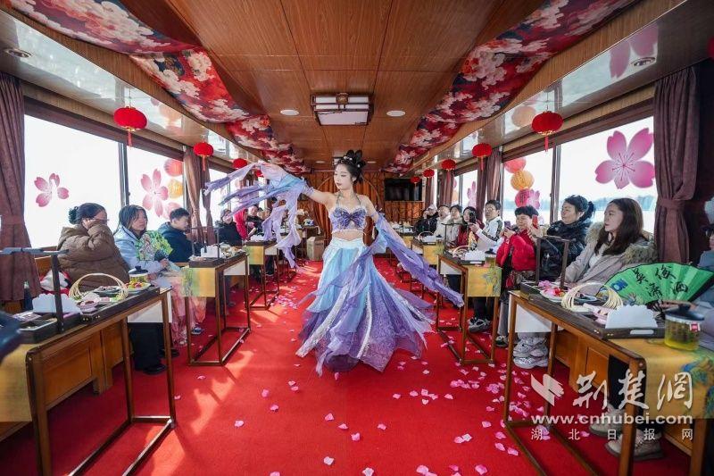 據(jù)介紹,全新上線的精品環(huán)湖游將為游客帶來沉浸式國風演藝體驗,從楚風園碼頭出發(fā),在游客登船之際,精彩好戲就已正式開鑼。畫舫離岸,演出開始,《元夕》《一面驚鴻》《錦瑟》等國風舞蹈亮相甲板,表演者們霓裳蹁躚,或婉約柔美,或英氣颯爽,在游客面前隨著悠揚楚樂,將楚舞的神韻演繹得絲絲入扣,不時還與游客隨機互動,同賀新春。