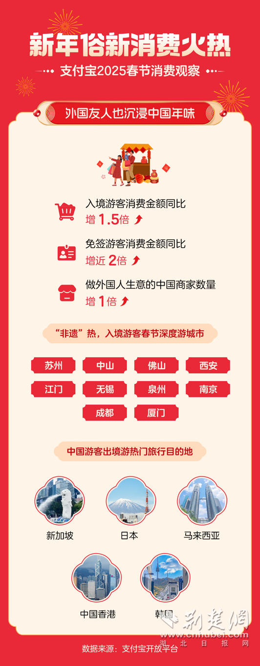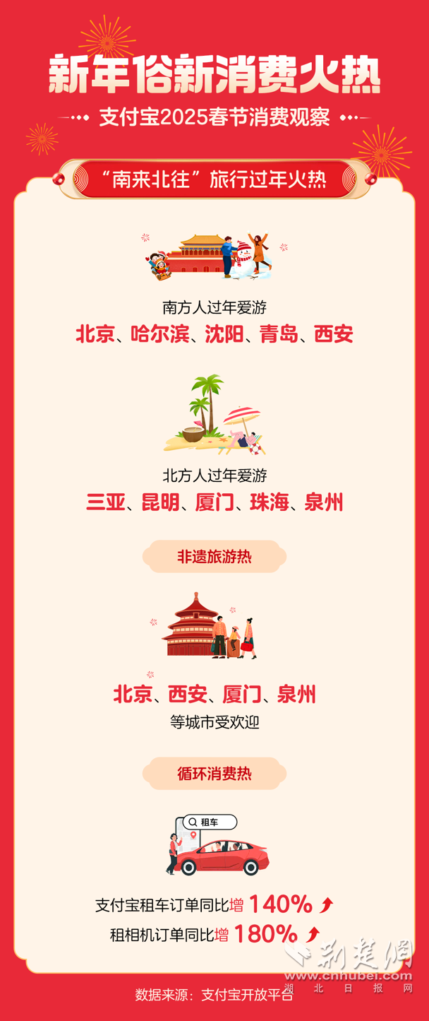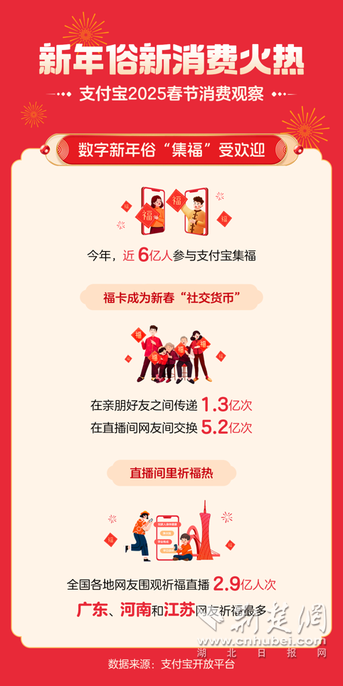 荊楚網(湖北日報網)訊 (通訊員 汪雨)2月3日,支付寶發(fā)布的2025春節(jié)消費觀察顯示:蛇年春節(jié),新年俗新消費火熱。