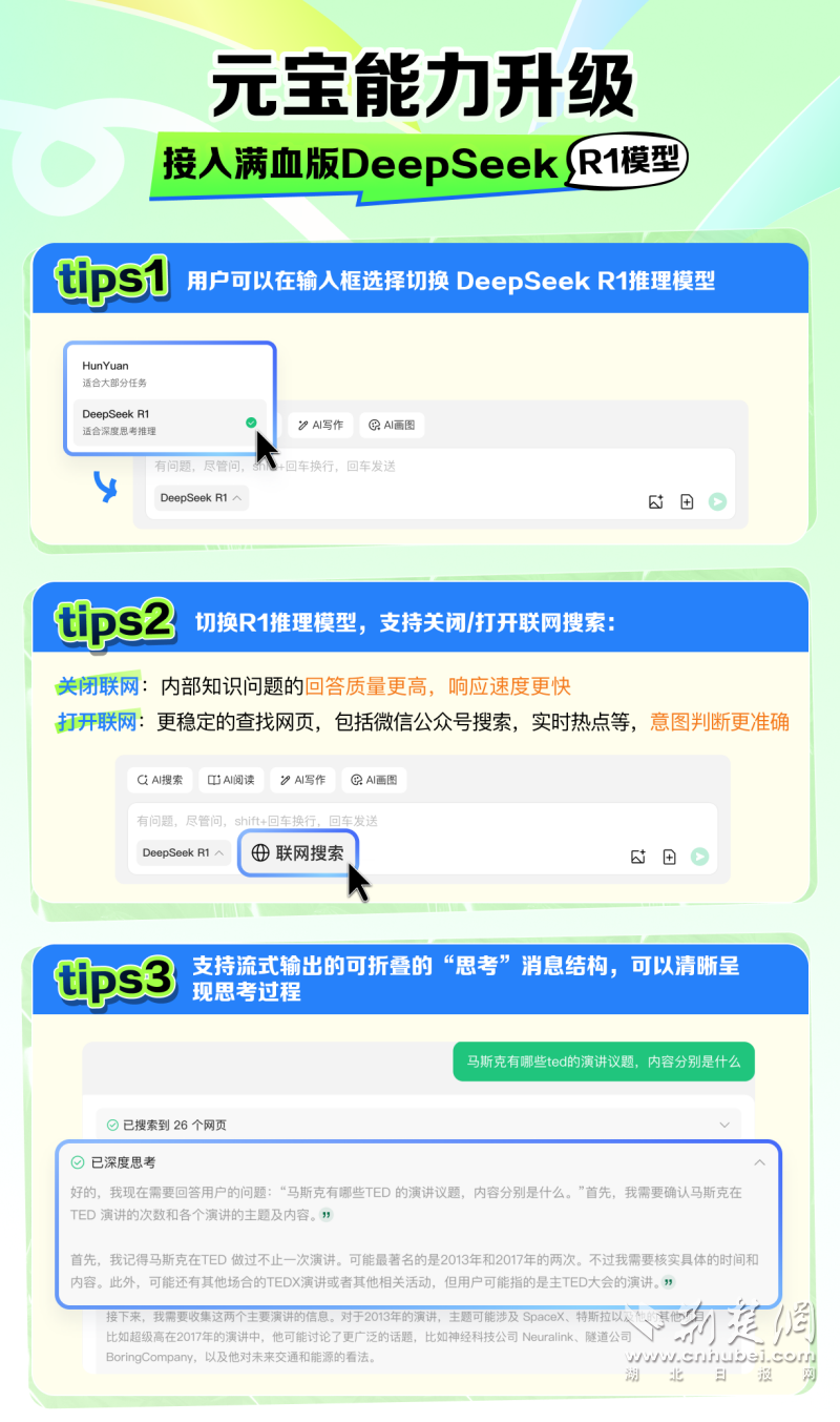 荊楚網(wǎng)(湖北日報網(wǎng))訊(通訊員 袁軒)2月13日,騰訊AI助手“騰訊元寶”迎來重大更新,同時支持混元和DeepSeek兩大模型,打開騰訊元寶并進入對話界面,即可免費使用DeepSeek-R1滿血版模型。