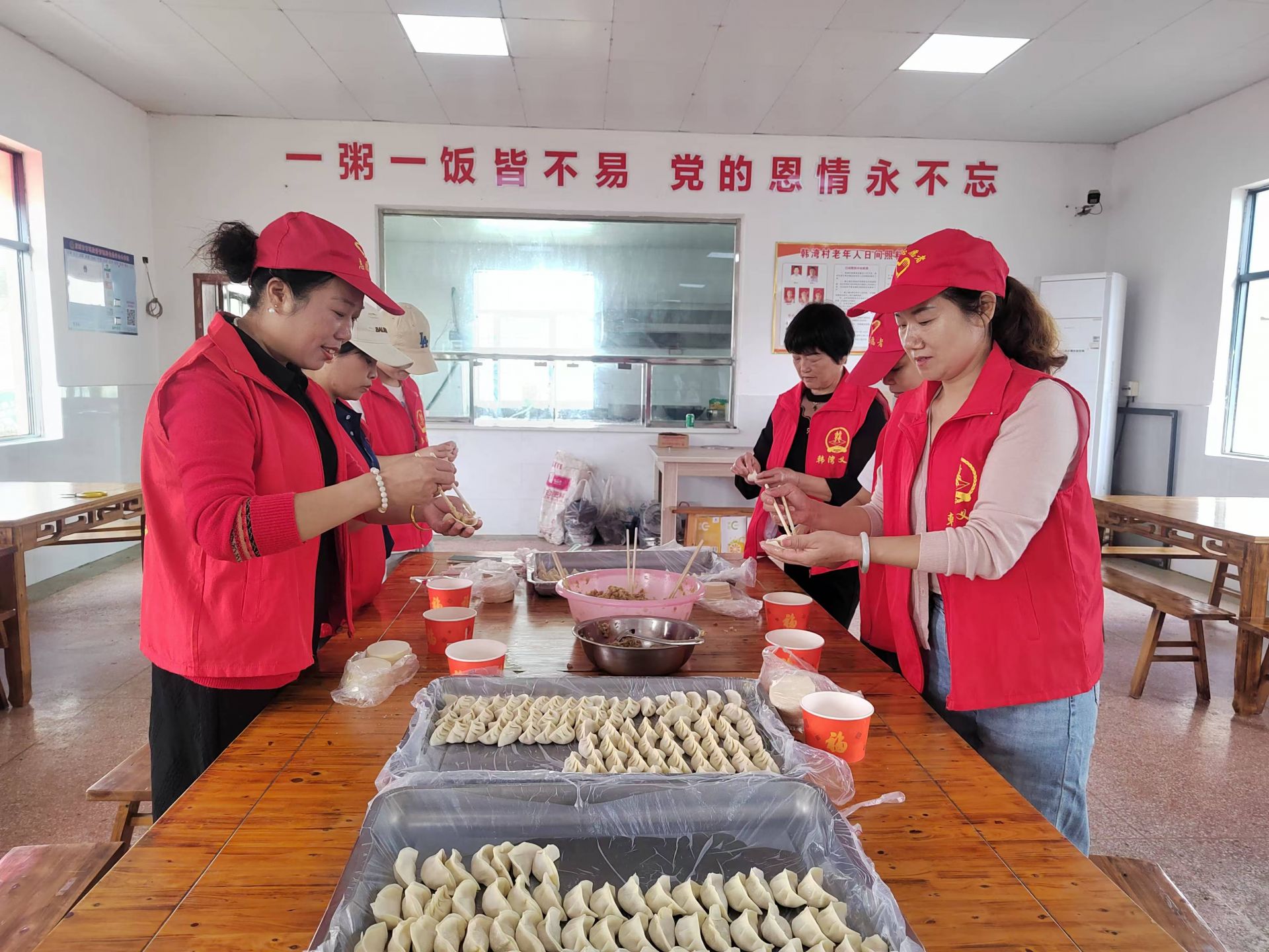 韓愛紅(右一)帶領志愿者為幸福食堂老人包餃子畫面。
