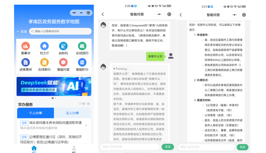 “針對‘群眾口語化表達與書面語差異大,導(dǎo)致咨詢事項難查找、難理解、難辦理’的痛點,這位‘新同事’究竟有多能干?”記者問。“辦事群眾登錄微信,搜索‘孝南區(qū)政務(wù)服務(wù)數(shù)字地圖’小程序,點擊‘智能問答’后,只要輸入類似‘我要開公司’等簡單指令、或語音輸入相關(guān)辦理事項,就能直接獲取相應(yīng)的辦事指南等信息,實現(xiàn)人機交流?!眳^(qū)政數(shù)局工作人員介紹。