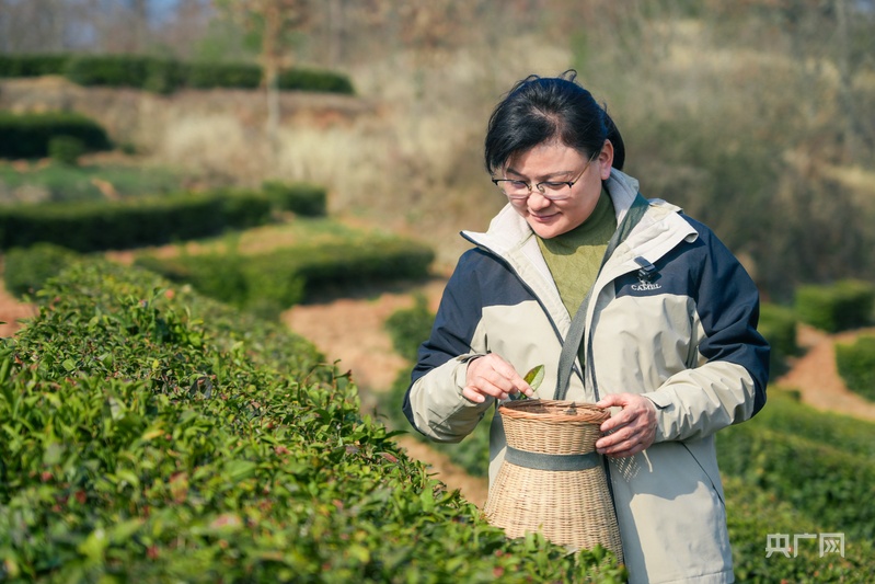 梁云英在茶園中采茶(央廣網(wǎng)記者左洋 攝)
