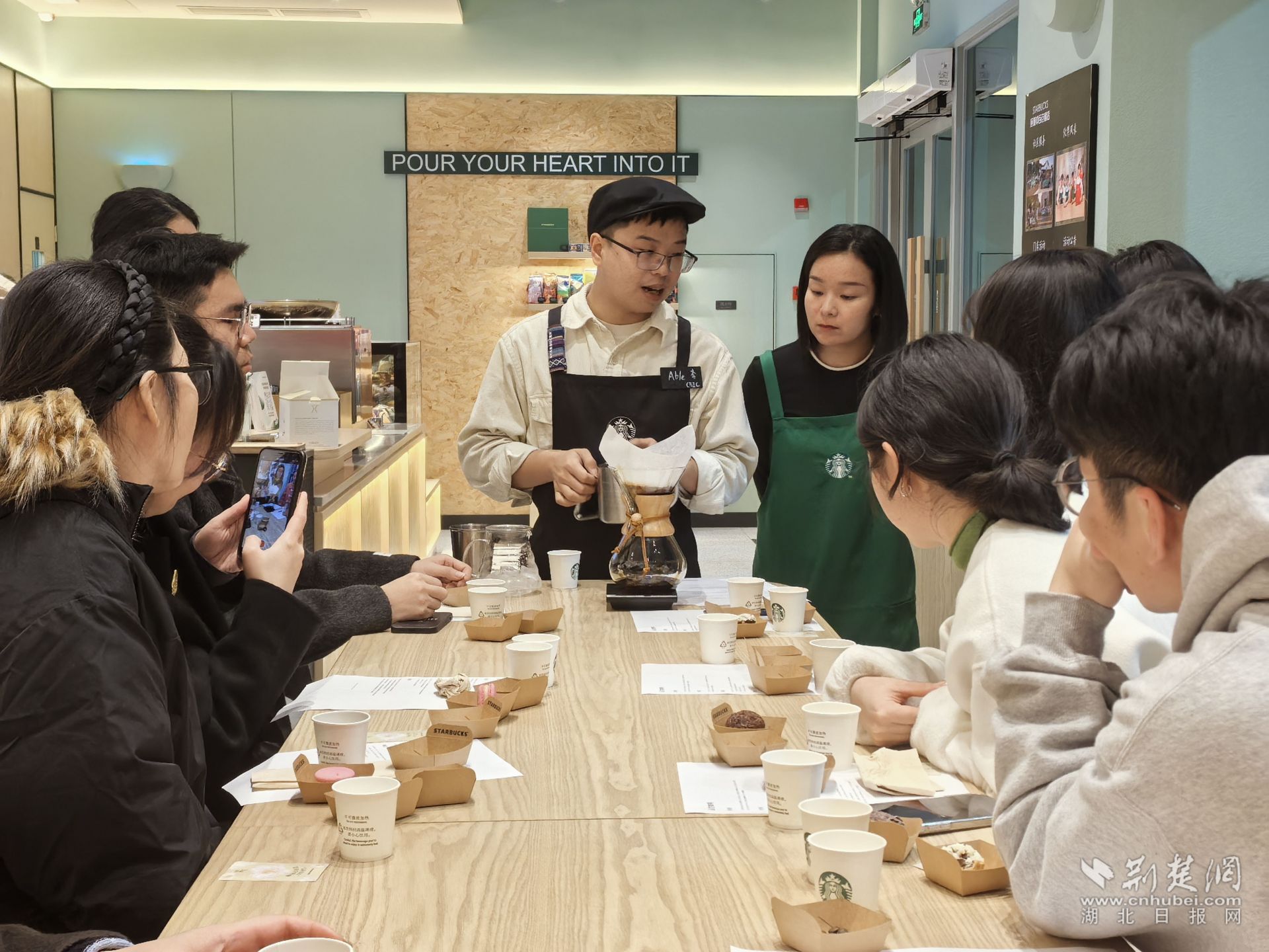 咖啡制作體驗(yàn)課上,老師拿著咖啡豆向?qū)W員們講解不同咖啡豆的香氣,學(xué)員們好奇地湊近,認(rèn)真地聞著,小聲交流著自己的感受;