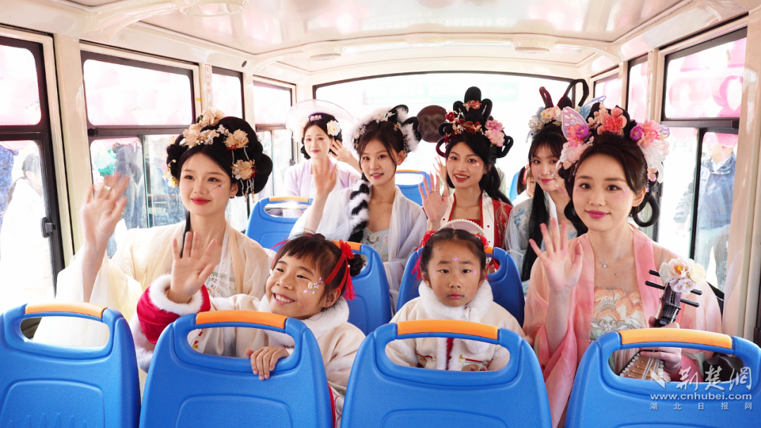身著漢服的“桃花七仙女”乘坐花車,緩緩駛?cè)敕奂t如綺霞、潔白似瑞雪、深紅若烈火的桃花林中。她們蓮步輕移,手持桃花團(tuán)扇,或輕嗅桃花,或倚樹而立,顧盼生姿,舉手投足盡顯古典韻味,與前來(lái)賞花的游客熱情互動(dòng)。