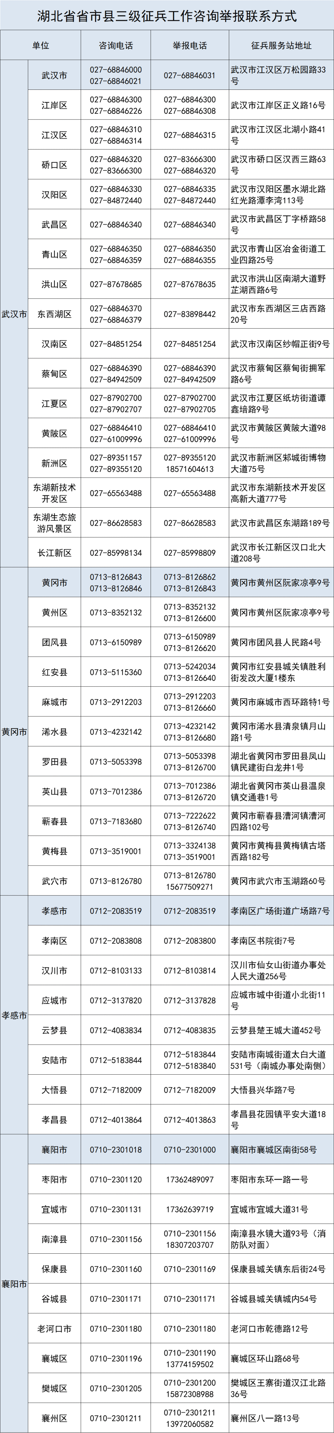 湖北省省市縣三級(jí)征兵工作咨詢舉報(bào)聯(lián)系方式