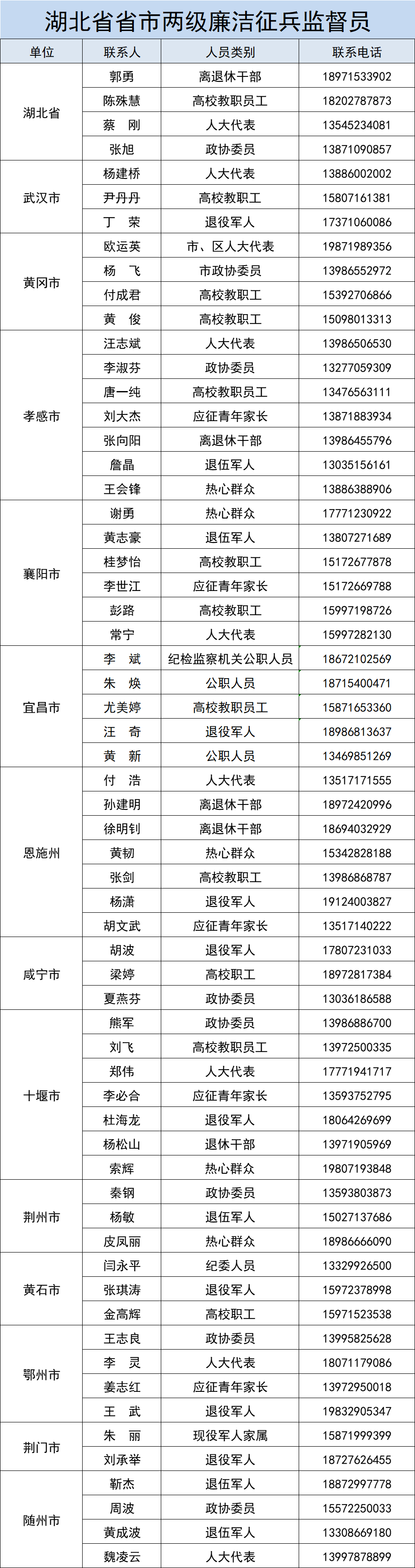 現(xiàn)將湖北省各級(jí)征兵辦廉潔征兵監(jiān)督舉報(bào)聯(lián)系方式和特聘監(jiān)督員名單予以公示,歡迎社會(huì)各界對(duì)征兵工作進(jìn)行監(jiān)督。