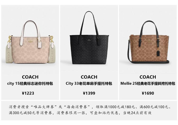 折扣不止于此,當(dāng)天上午10點,消費者搜索“唯品大牌券”或“海南消費券”,可搶滿1000元減180元、滿600元減100元、滿300元減50元等消費券,消費券限用一張,當(dāng)晚24點前有效,可以和當(dāng)天活動優(yōu)惠疊加使用——甚至還能用于五糧液等名酒。算下來,Coach爆款托特包甚至僅為千元左右。