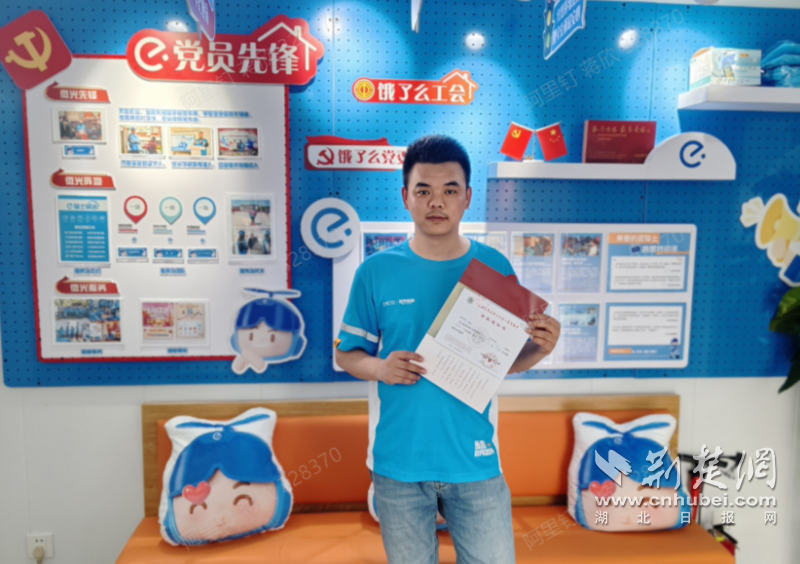 餓了么上海藍(lán)騎士程永亮收到大學(xué)的錄取通知書(shū)。通訊員供圖