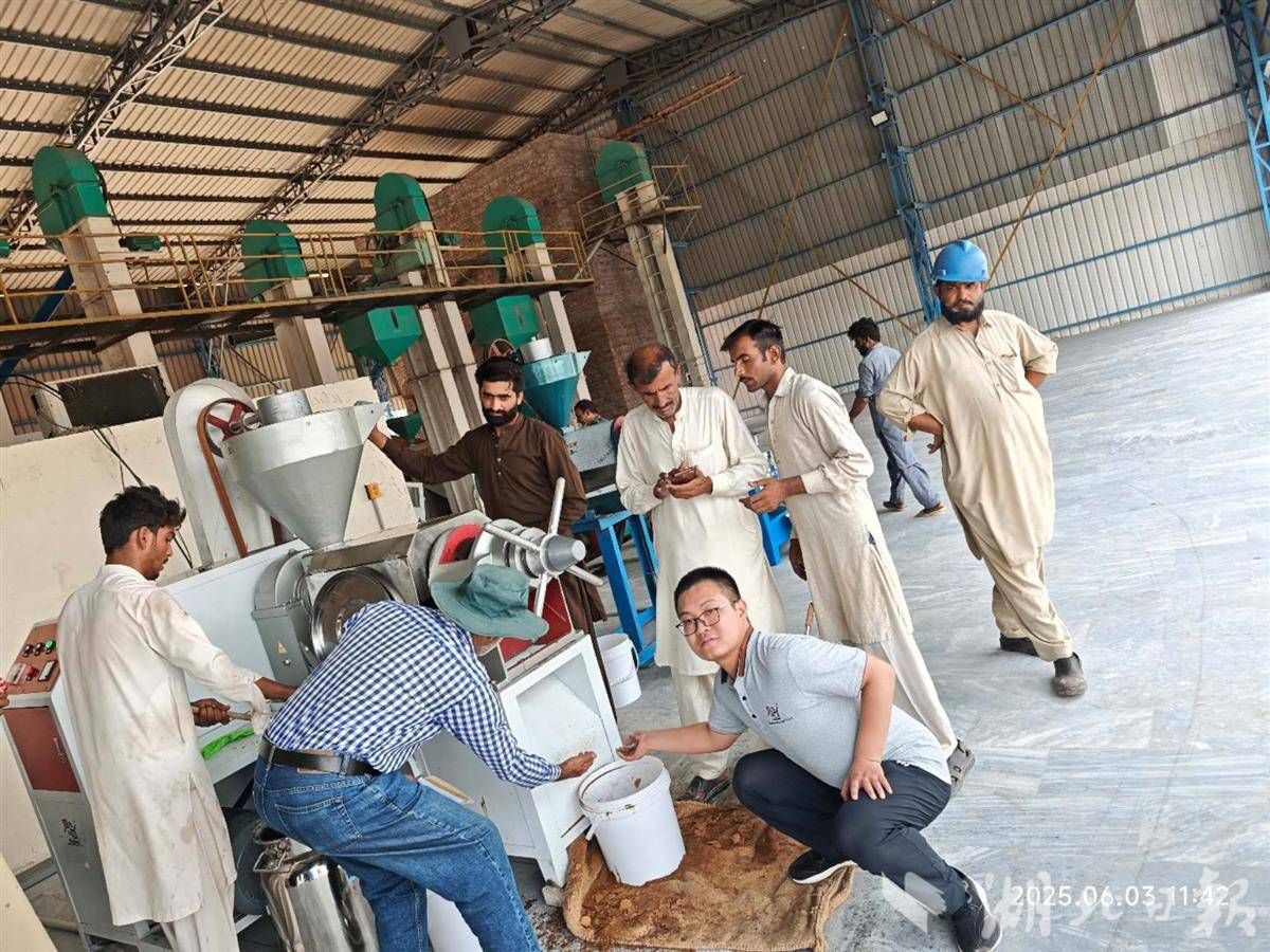 為適配巴基斯坦種植習(xí)慣,慶發(fā)禾盛自主研發(fā)了兩款定制化收割設(shè)備,實(shí)現(xiàn)油菜減損增效。同時(shí)根據(jù)當(dāng)?shù)丶庸ち?xí)慣,從湖北引入小型榨油設(shè)備,方便種植戶分散進(jìn)行油菜籽加工。