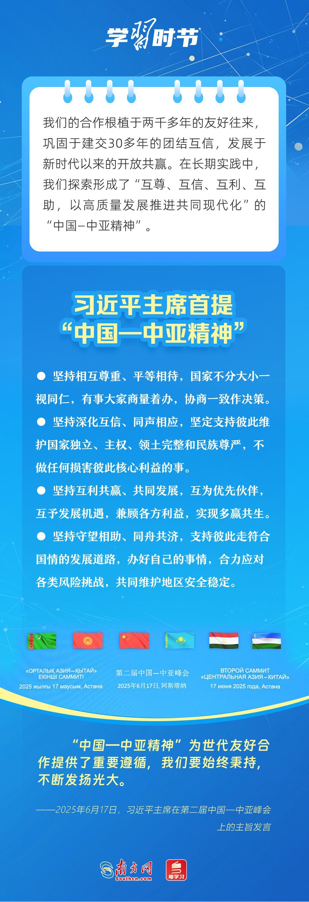 當(dāng)?shù)貢r(shí)間6月17日下午,第二屆中國(guó)—中亞峰會(huì)在哈薩克斯坦首都阿斯塔納獨(dú)立宮舉行。習(xí)近平主席在主旨發(fā)言中,首次提出“互尊、互信、互利、互助,以高質(zhì)量發(fā)展推進(jìn)共同現(xiàn)代化”的“中國(guó)—中亞精神”,為世代友好合作提供了重要遵循。