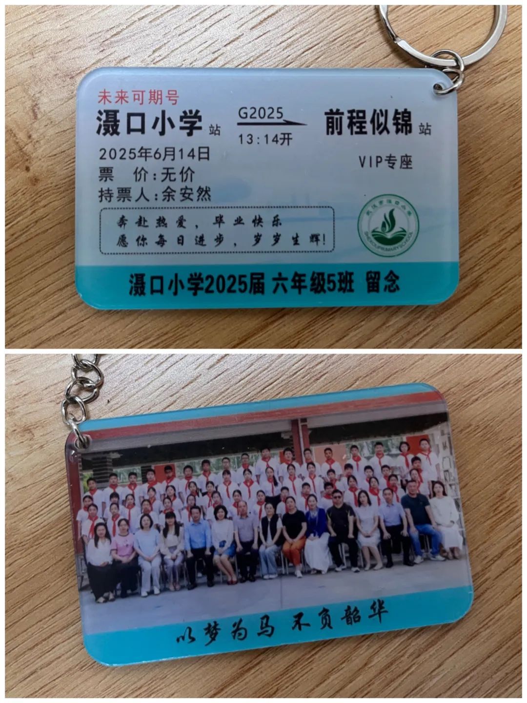 這張“火車票”不簡單,是獨一無二的定制款!這趟車叫“未來可期號”,車次是G2025,從“灄口小學”站開往“前程似錦”站。發(fā)車時間特意定在6月14日13時14分,這是孩子們在校的最后一天,意義非凡!每張票上都印著?;眨制比耸呛⒆觽兊拿?。票價那一欄寫著“無價”,座位更是“VIP專座”,滿滿都是我對他們的愛和期許!