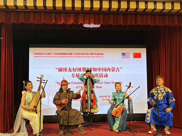 人民網舊金山7月18日電 (記者鄧圩)馬頭琴聲聲,口弦琴悠揚,琵琶曲纏綿,蒙古族贊歌、悠遠的情歌點燃舊金山的熱情。中國駐舊金山總領館禮堂中,熱烈而歡騰的掌聲一陣又一陣。當?shù)貢r間7月18日,紀念內蒙古自治區(qū)與加州建立友好區(qū)州關系25周年慶?;顒訉鑫乃囇莩鲈诖伺e行,來自中美兩國的政商、文化界及友好人士齊聚一堂,舊雨新知共話中美省州友好情誼。