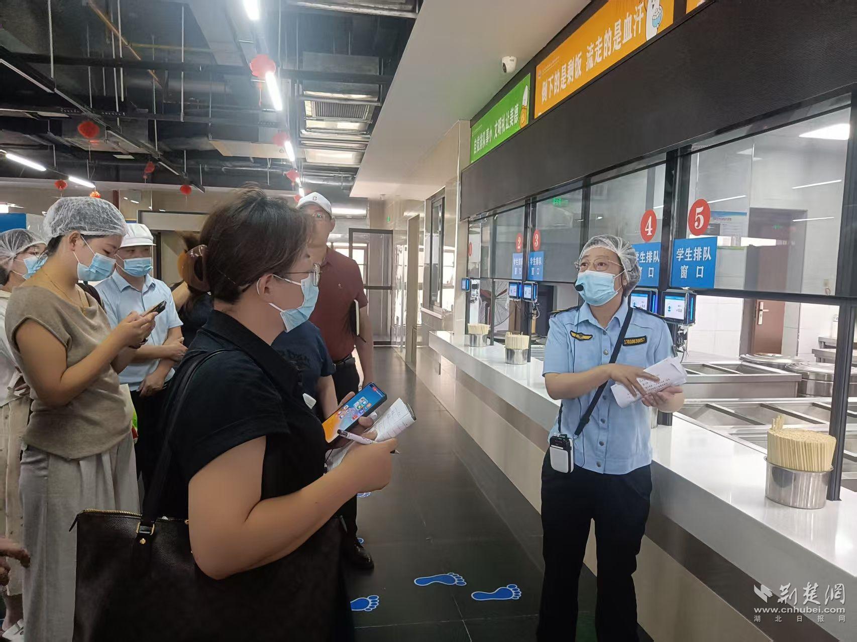 吳家山第四中學(xué)食堂內(nèi),工作人員正忙碌著為軍訓(xùn)學(xué)生做午餐。東西湖區(qū)市場(chǎng)監(jiān)管局餐飲科執(zhí)法人員帶領(lǐng)與會(huì)人員一邊實(shí)地觀摩,一邊現(xiàn)場(chǎng)授課。