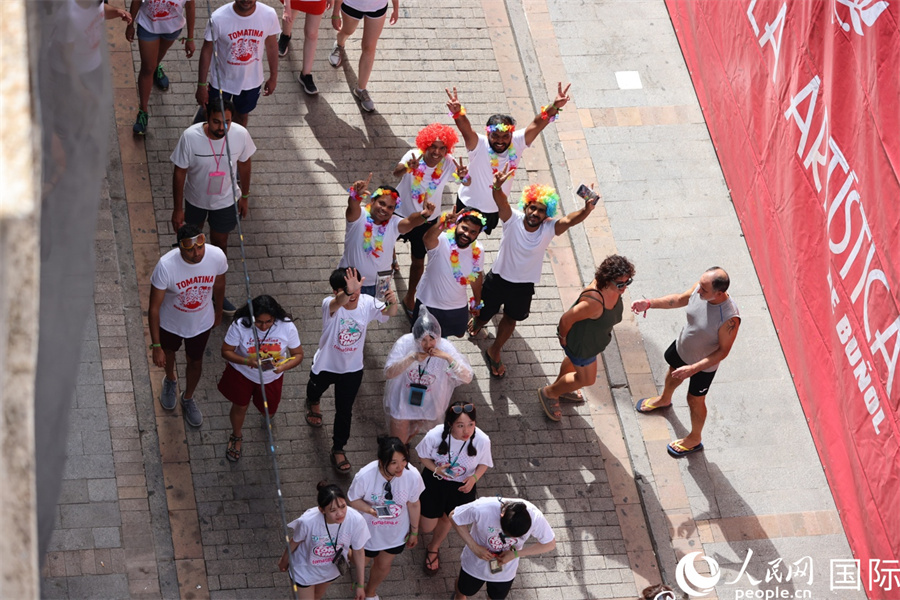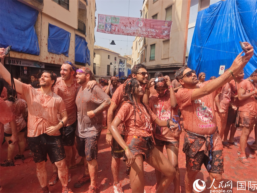 圖為人們在“西紅柿大戰(zhàn)”結(jié)束后合影留念。人民網(wǎng)記者 許海林?jǐn)z